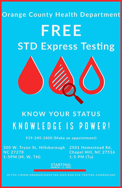 If youre looking for cheap std testing clinics in the Santa Ana area to get a HIV Herpes Chlamydia Gonorrhea Syphilis or Hepatitis screening for yourself or your partner you can get tested today by selecting an option below to find an affordable std test clinic near you. Same day std testing locations also available with results in 1-2 days. STD Testing Counseling We provide free confidential counseling and testing for sexually transmitted diseases STD at both clinic locations Hillsborough and Chapel Hill.