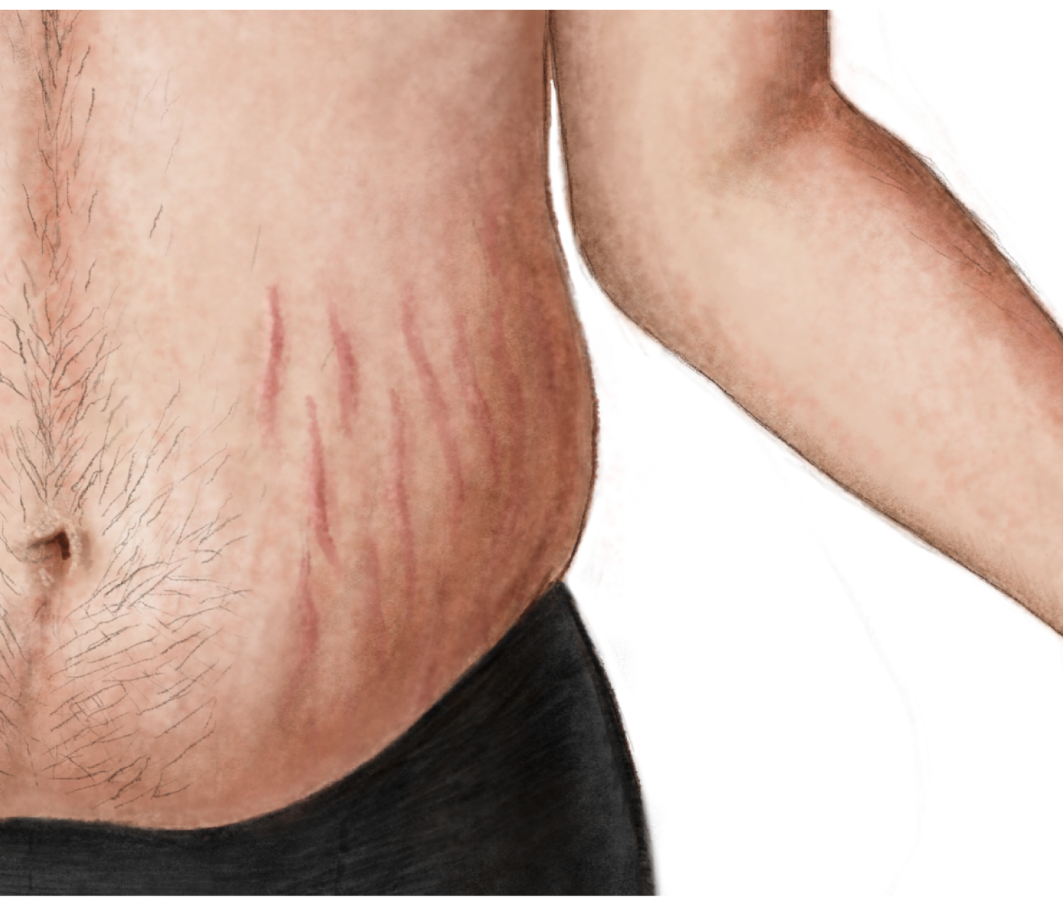 Die Hauterscheinungen machen sich in Form von Quaddeln roten Flecken Bläschen Blasen. Die Streifen treten bevorzugt an besonders stark belasteten Geweben wie Bauch Hüften Gesäß Oberarmen und Brüsten auf. Ich habe als Mann zwei große rote Streifen von links nach rechts am Bauch.
