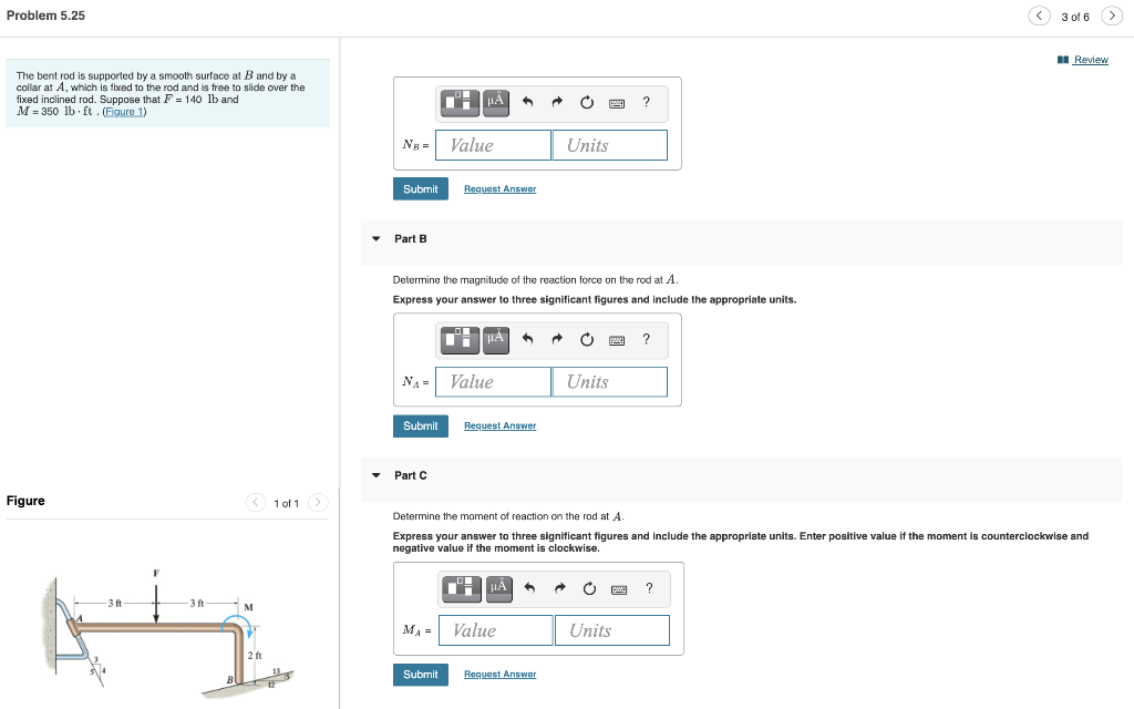 Figure 1 Figure 1 of 1 F 3 ft 3 ft M А 3 2 ft 13 B 12 Determine the magnitude of the reaction force on the rod at B. Determine the reactions on the bent rod which is supported by a smooth surface at B and by a collar at A which is fixed to the rod and is free to slide over the inclined bracket. Mechanically we have this lover arm here its cash to appear it how supported by a spring.